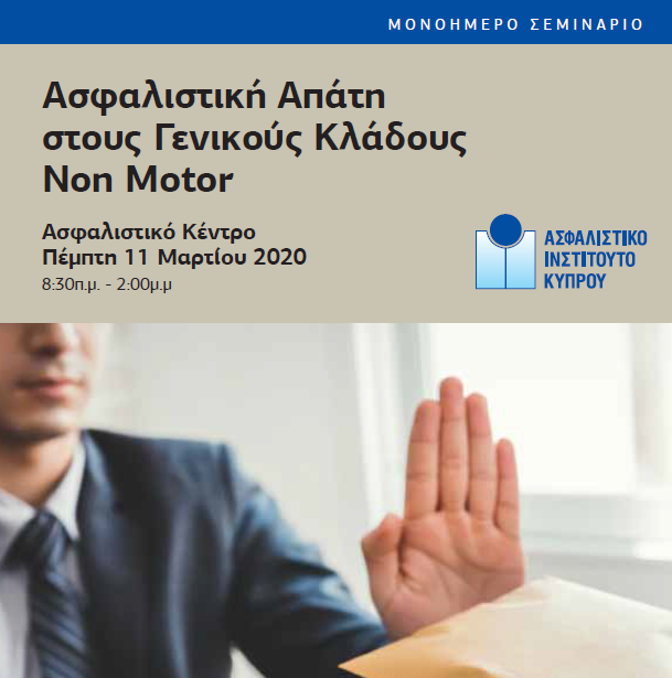 ΜΟΝΟΗΜΕΡΟ ΣΕΜΙΝΑΡΙΟ – ΑΣΦΑΛΙΣΤΙΚΗ ΑΠΑΤΗ ΣΤΟΥΣ ΓΕΝΙΚΟΥΣ ΚΛΑΔΟΥΣ NON MOTOR Posted at h in News by iicUser18 Ασφαλιστικό Κέντρο – Τετάρτη 11 Μαρτίου 2020 8:30π.μ. – 2:00μ.μ Διαβάστε Περισσότερα Share Print page