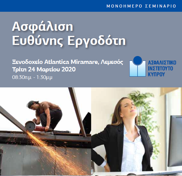 ΜΟΝΟΗΜΕΡΟ ΣΕΜΙΝΑΡΙΟ – ΑΣΦΑΛΙΣΗ ΕΥΘΥΝΗΣ ΕΡΓΟΔΟΤΗ Posted at h in News by iicUser18 Ξενοδοχείο Atlantica Miramare, Λεμεσός Τρίτη 24 Μαρτίου 2020 08:30π.μ. – 1:30μ.μ Διαβάστε Περισσότερα Share Print page